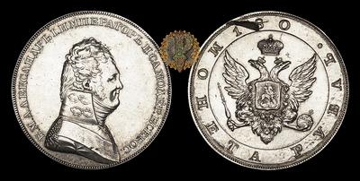Очень редкий и интересный экземпляр, требующий более детального изучения. На обеих сторонах монеты не просматриваются какие-либо следы разрушения штемпелей. Обычно их отсутствие является основным признаком пробных монет оригинальной чеканки. Заготовкой для данной монеты послужил рубль Екатерины II (следы перечекана видны на реверсе и гурте). Подобный экземпляр (также со следами перечекана) был продан в 1913 году на аукционе во Франкфурте на Майне за 475 марок (Аукцион “Adolph Hess Nachfolger” (10.03.1913) “Sammlung Graf J.J.Tolstoi. Russische Munzen des XIX Jahrhunderts”. лот 384).