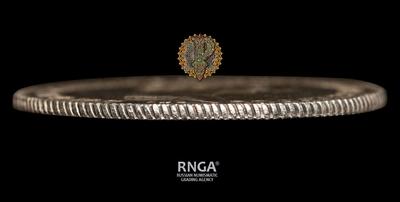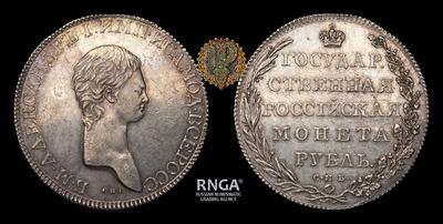 Один из самых редких и интересных вариантов из всей серии новоделов пробных рублей Александра I. Для его изготовления использовались те же штемпеля аверса, какими были отчеканены оригинальные пробные "Портретные" рублевики 1801 года. Для чеканки реверса использовали штемпеля общегосударственной монеты рублевого достоинства образца 1802-1805 годов.