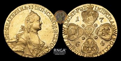 Империалы т.н. типа «с шарфом на шее» чеканились с 1764 по 1765 годы. По деталям портрета подобны 10 рублям 1762-1763 годов Петербургского Монетного Двора, однако при их чеканке применялась иная монетная стопа.