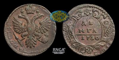 Денга 1730 года. Перечекан из копейки 1704-1718 годов