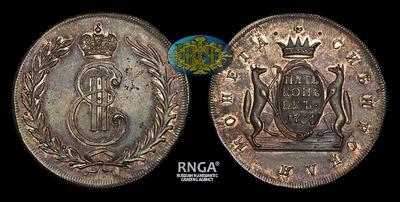 Очень редкий по варианту гуртового оформления новодел пробных “Сибирских” 5 копеек 1764 года Сузунского Монетного Двора. По имеющийся в нашем распоряжении информации, данный экземпляр является единственным когда-либо выставлявшимся на аукционные торги. Не описан в каталоге А.А.Ильина. Отсутствовал в собрании медных монет России Б.Брекке (Норвегия). Редкость монеты подтверждена в каталоге В.В.Биткина, где дается ссылка на данный экземпляр, как на единственно известный.