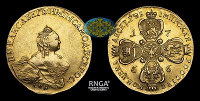 10 рублей 1756 года чеканки Санкт-Петербургского Монетного Двора являются одной из "простых" монет данного типа. В этом году было отчеканено около 25 000 десятирублевиков, тогда как годом ранее, в 1755 году, всего 5 500 штук. Прекрасная возможность пополнить коллекцию типовой, прекрасной по сохранности монетой, не переплачивая за редкий год.