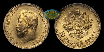 Редкая годовая разновидность десяти рублей времени правления Николая II в отличной степени сохранности. По официальной статистике компании NGC всего три монеты имеют более высокую степень сохранности MS66.