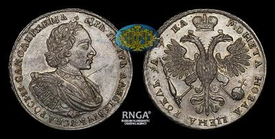 Аверс: Украшенный крест между точек над головой. Пальмовая ветвь на груди. "РОСИI".