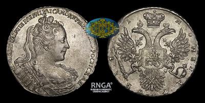 Очень “интересный”, возможно редкий вариант рубля 1731 года. Данный тип и разновидность отдельно выделены во всех наиболее часто используемых нумизматических каталогах. Впервые описание такого рубля появилось в 1904 году в научной работе одного из известнейших русских нумизматов С.И.Чижова. Вместе с несколькими другими рублями 1731 года автор выделяет и размещает изображение именно этого экземпляра в своем справочнике. Впоследствии изображение этой же монеты приводится в каталогах М.Е.Дьякова и В.В.Биткина, что также указывает на ее безусловную редкость. Важно отметить, что в каталоге В.В.Биткина (В.В.Биткин, Киев 2003 г. “Сводный каталог монет России”) степень ее редкости соответствует R1, а информация о продажах монеты данной разновидности отсутствует. Нам также не удалось найти второго подобного экземпляра среди большого количества рублей 1731 года в аукционных продажах прошлых лет. Вероятнее всего (по причине плохой закалки), штемпель лицевой стороны треснул и разрушился в самом начале чеканки (на аверсе хорошо заметен сильный раскол штемпеля). Видимо, монет данного типа было отчеканено совсем незначительное количество, а дошедшие до нас и вовсе единичны. Красивая и очень редкая монета со старинной коллекционной историей и безупречным провенансом.
