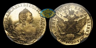 В 1755 году в русской денежной системе появились сразу два абсолютно новых номинала крупной золотой монеты. По Высочайшему указу в денежный оборот была введена десяти и пяти рублевая монета. По задумке властей, подобное решение должно было повлиять на подъем внутреннего рынка, значительно усилить существующие, а также создать новые торговые связи и отношения. Появлению новой монеты предшествовала кропотливая работа над созданием ее внешнего вида, в том числе выбор подходящего названия. В результате появилась удивительная монета с двойным номиналом на реверсе - “Десять рублей-Елизаветин Золотой”. Монета была отчеканена по десятирублевой стопе и имела вес 16,54 грамма. Стоит заметить, что аверс этой уникальной пробной монеты (сегодня известной в единственном экземпляре в собрании Государственного Эрмитажа) полностью идентичен аверсу обычных 10 Рублей 1755 и последующих годов чеканки. Значительные отличия состоят в реверсе. Тип и разновидность предлагаемого нами экземпляра наиболее близки к оригиналу “Елизаветиного Золотого”. Портрет Императрицы и оформление аверса такое же как на тиражных 5 Рублях 1755 года. Реверс также полностью повторяет стилистику оригинальной пробной монеты. Текст и расположение круговой надписи, пропорции и детали орла в точь соответствуют реверсу пробного “Елизаветиного Золотого”, с той лишь разницей, что предлагаемый нами экземпляр отчеканен по пятирублевой стопе. Возможно, именно поэтому некоторые известные нумизматы дореволюционной России, в том числе В.И.Петров, считали данный тип “Елизаветиного золотого” также пробной монетой оригинальной чеканки.