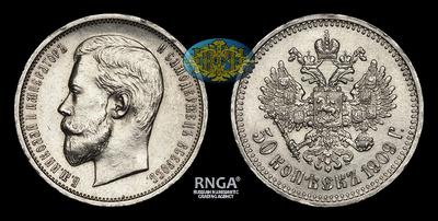 Довольно редкая годовая разновидность. Официальный тираж 50 копеек 1909 года составил всего 50 011 штук.