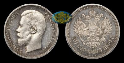 Один из малотиражных полтинников Николая II. Отчеканено всего 50 011 штук, из которых совсем небольшое количество в исполнении PROOF. Дополнительную ценность данному экземпляру придает его исключительный провенанс. Происходит из двух замечательных нумизматических собраний, владельцами которых особое внимание отводилось качеству собираемого материала.