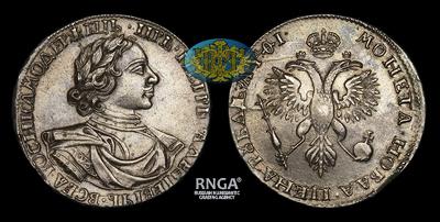 Аверс: Точка над головой. Голова большая. Бюст большой. Один ряд заклепок на воротнике. Один ряд заклепок на груди. С вышивкой на рукаве. Один ряд заклепок на рукаве. “РОСИI”. Точки разделяют круговую надпись.