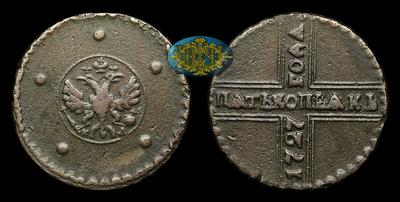 Центральная корона малая, с крестом. Орел меньше. Крест державы не касается крыла. “НД” малые. Три пера в хвосте орла. Орел в линейном кольце.