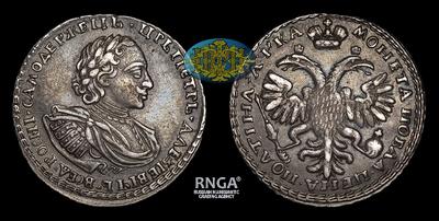 Аверс: Тип 1720-1722 годов, т.н. «Бюст в супервесте». Малый трилистник над головой. Наплечники с тремя фестонами на плече. Звезда ордена без лучей на груди. Малые трилистники разделяют круговую надпись.