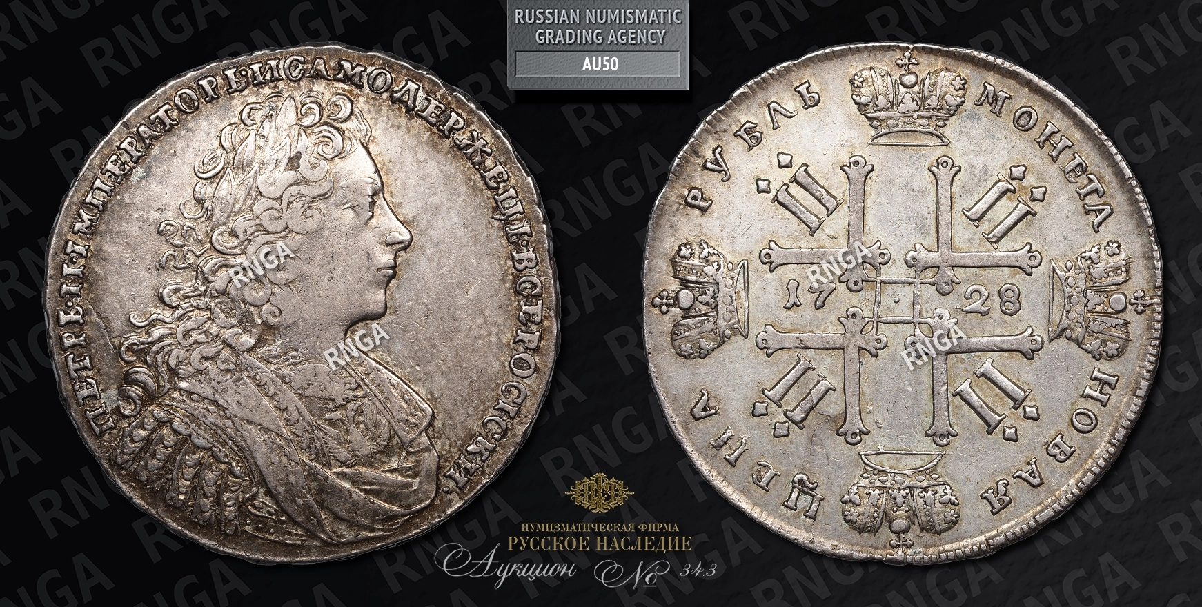 Аверс: Портрет 1728-1729 годов. Голова не разделяет круговую надпись. Ленты у лаврового венка. Три трилистника над орлом. Без звезды на плаще. Пять фестонов со звёздами. Наплечник с пятью лентами.