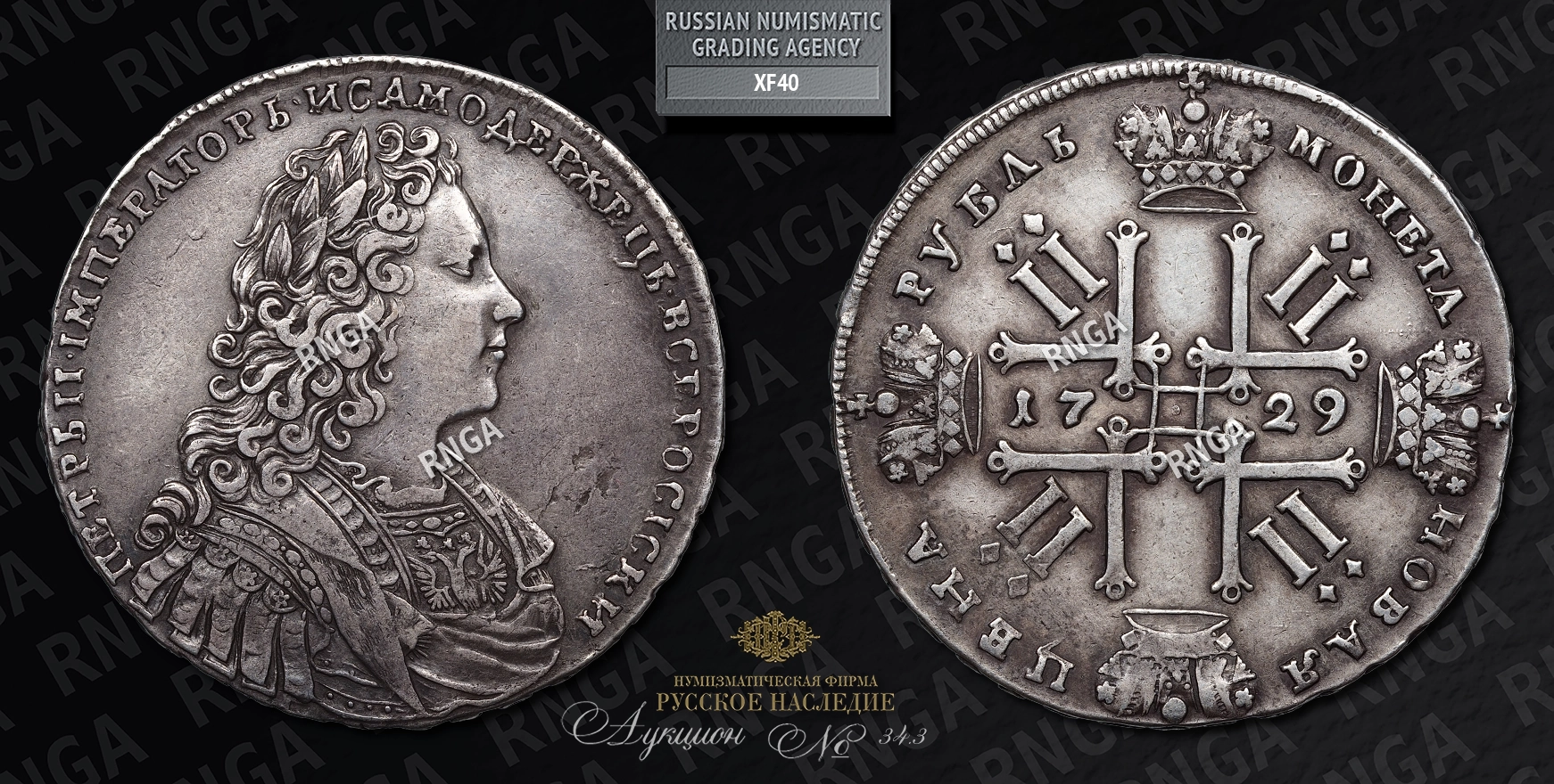 Аверс: Портрет 1728-1729 годов. Без лент у лаврового венка. Три трилистника над орлом. Звезда на плаще. Четыре фестона со звездами.
